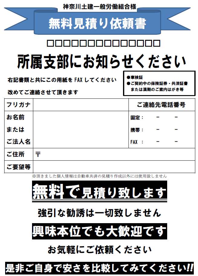車検証、証券証を所属支部にファックスし、見積依頼をしてください。見積は無料です。