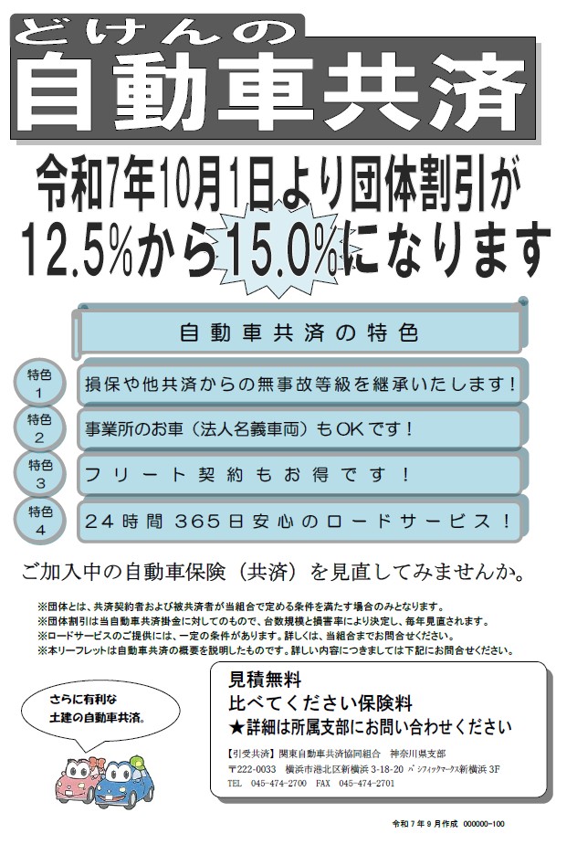 今年の10月1日から、どけんの自動車共済の団体割引が15.0%に拡充されました。