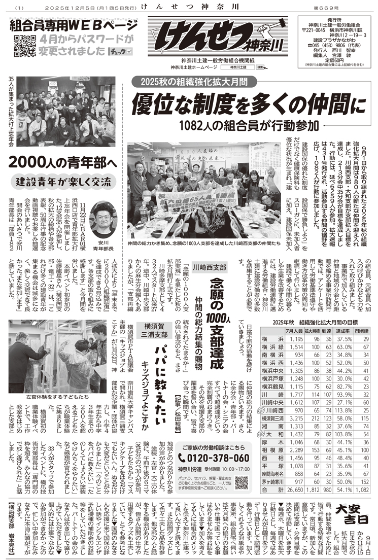 9月1日から取り組まれた2025年秋の組織強化拡大月間は980人の新たな仲間を迎え入れました。川崎西支部・大和支部が支部拡大目標を達成し、213分会中35分会が目標を達成しました。行動には、延べ6259人が参加。拡大速報は431号発行され、活動参加する仲間の裾野を広げ、1082人が行動に参加しました。