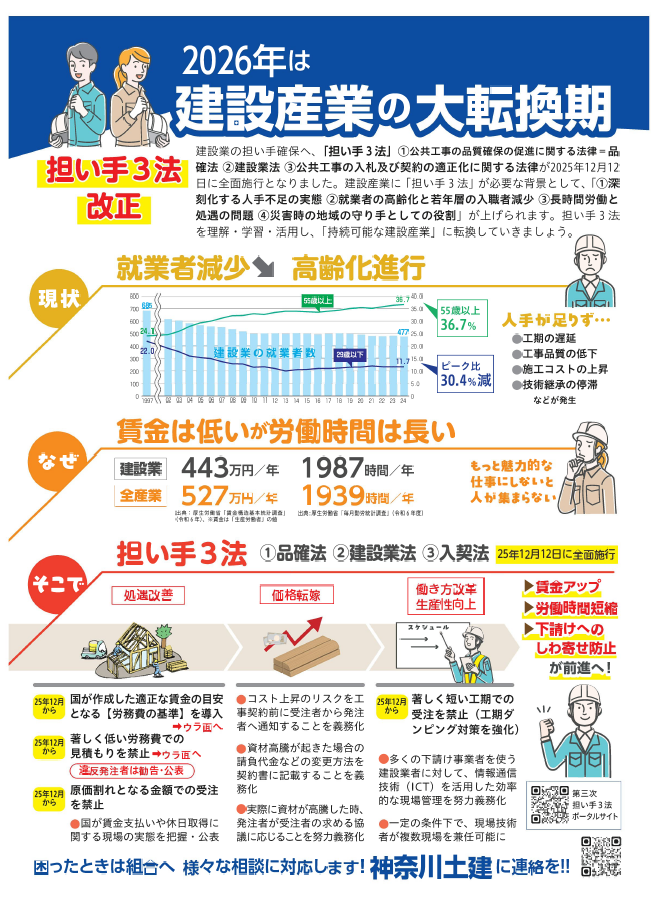 建設業の担い手確保へ「担い手3法」①公共工事の品質確保の促進に関する法律=品確法、②建設業法、③公共工事の入札及び契約の適正化に関する法律が2025年12月12日に全面施行となりました。